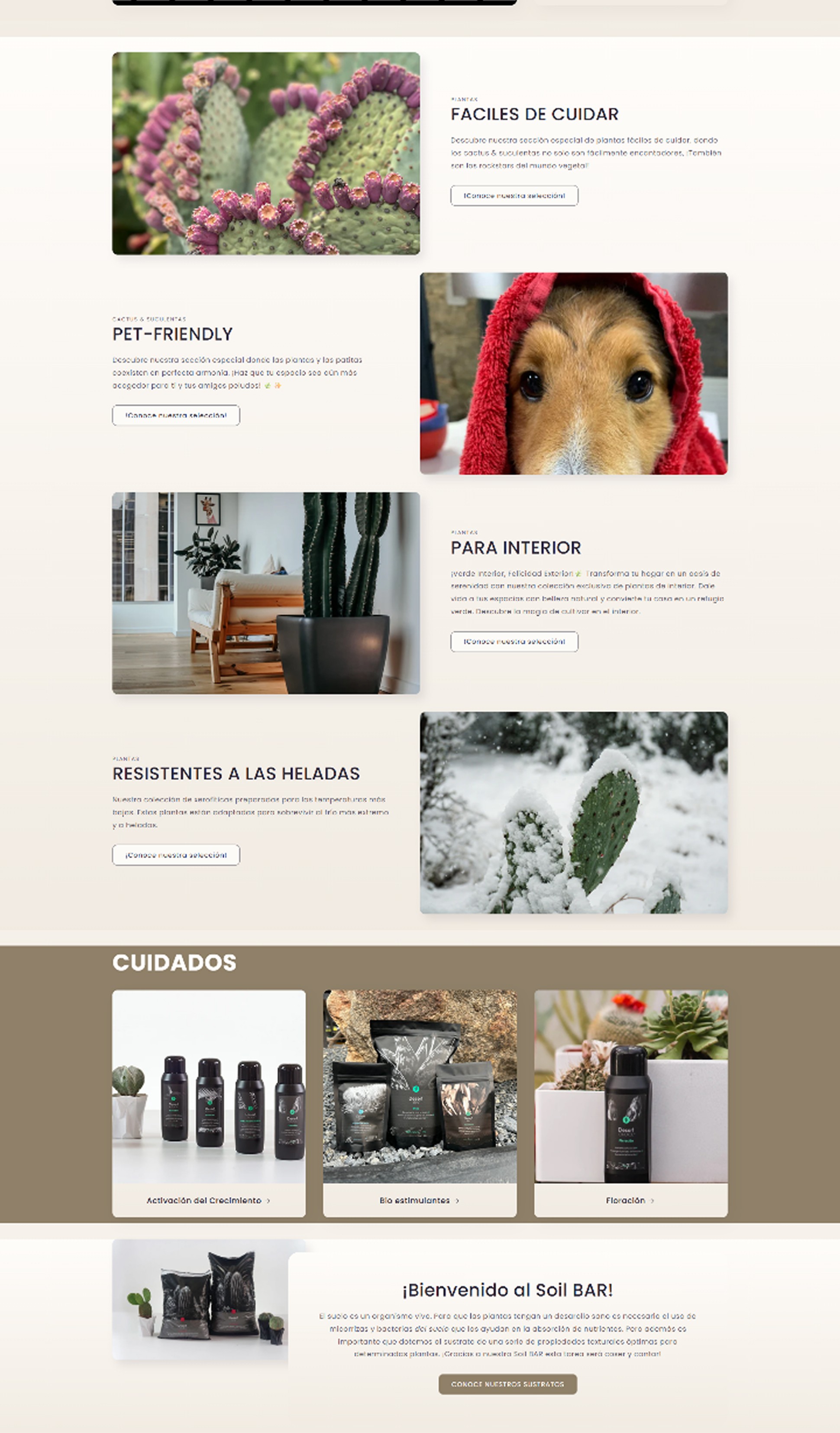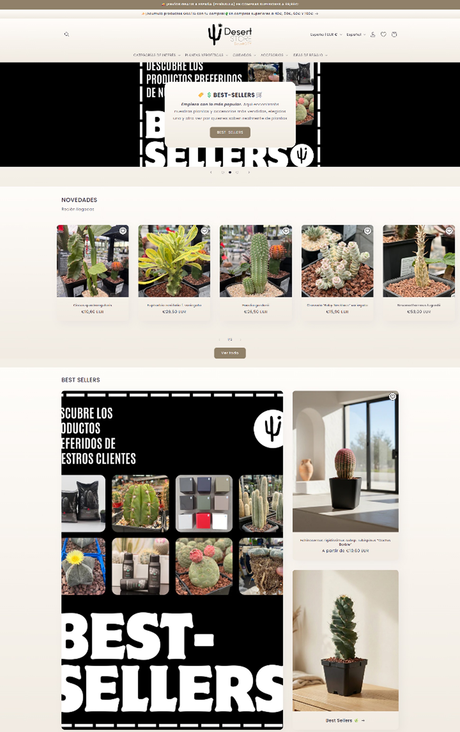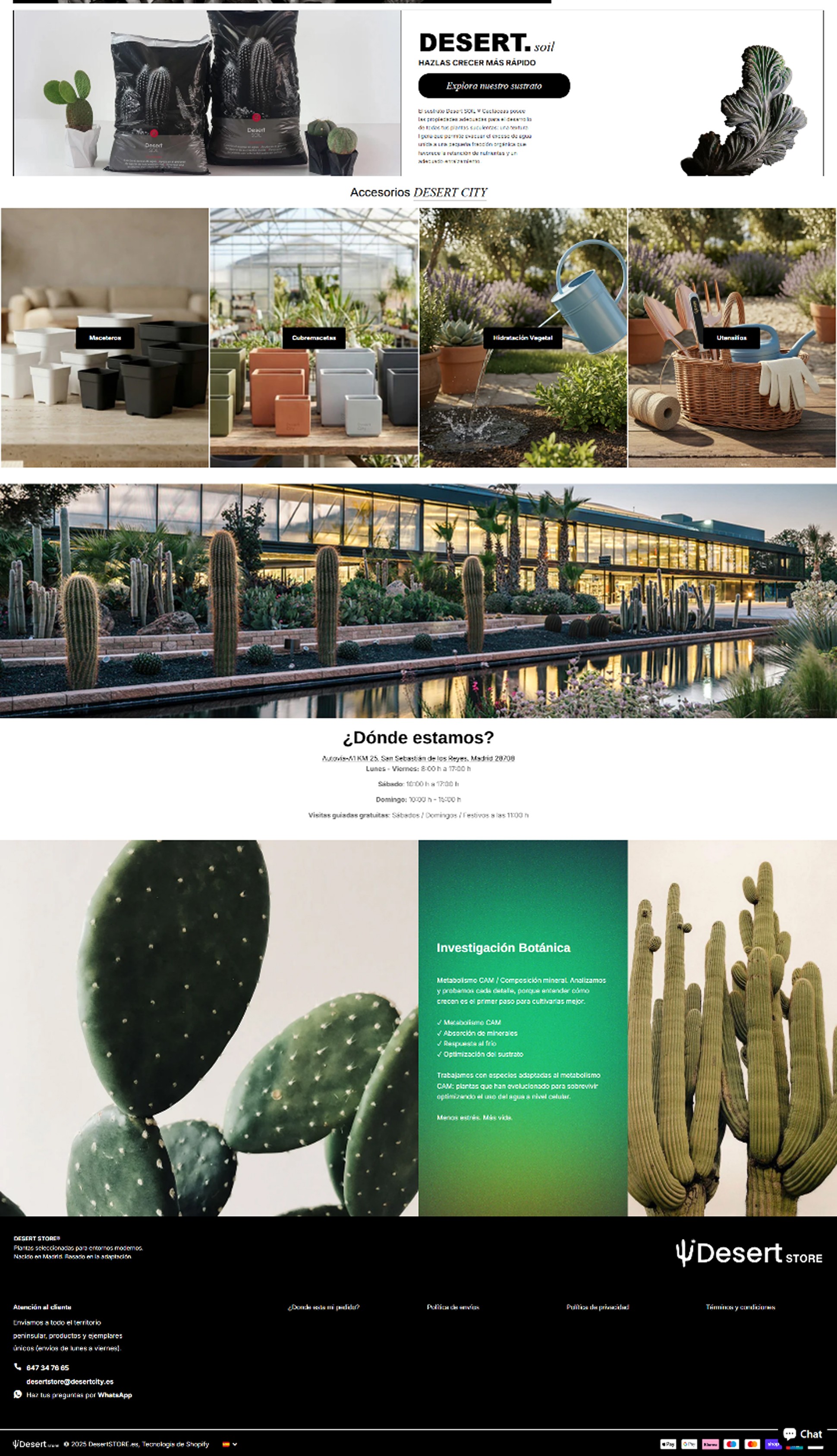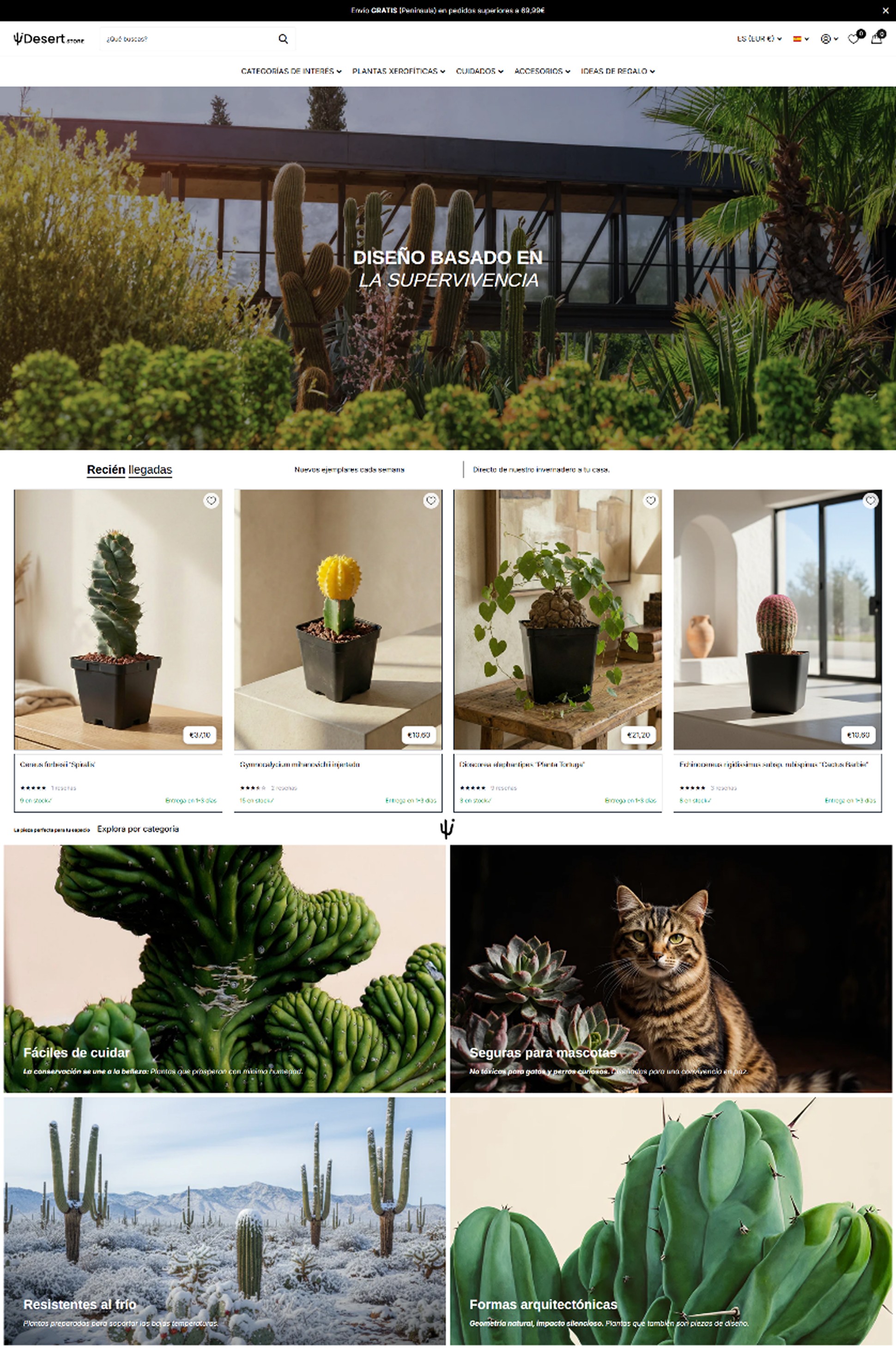 La tienda online no reflejaba la identidad premium del espacio físico Desert City. Se rehizo por completo el branding y la experiencia de usuario, eliminando fricciones y construyendo una narrativa visual coherente con plantas exóticas y de alto valor. El objetivo fue que el usuario percibiera calidad y exclusividad desde el primer segundo, facilitando la decisión de compra.